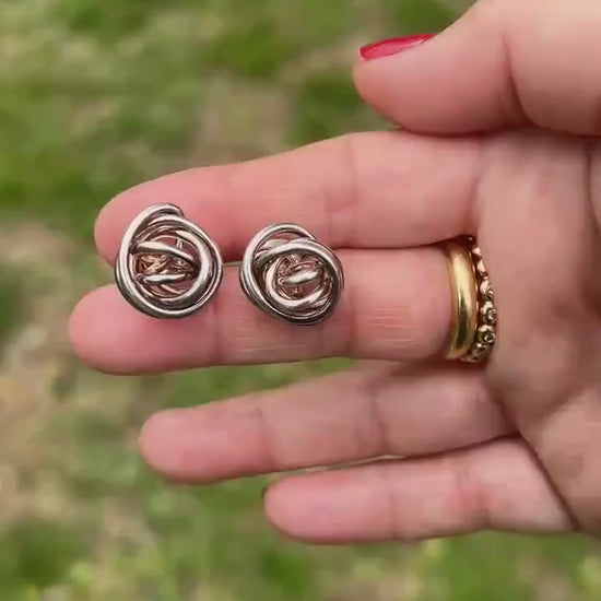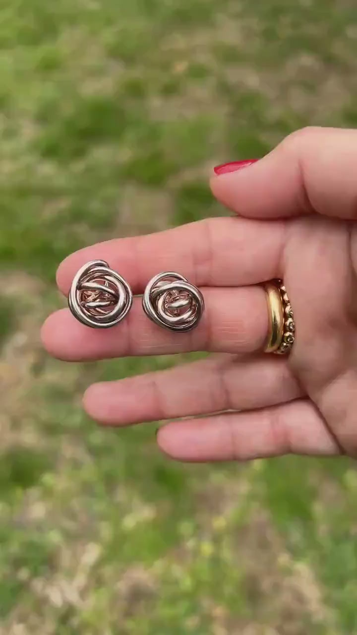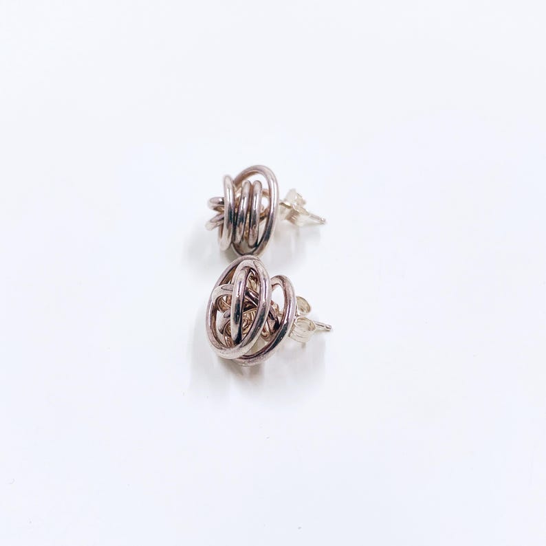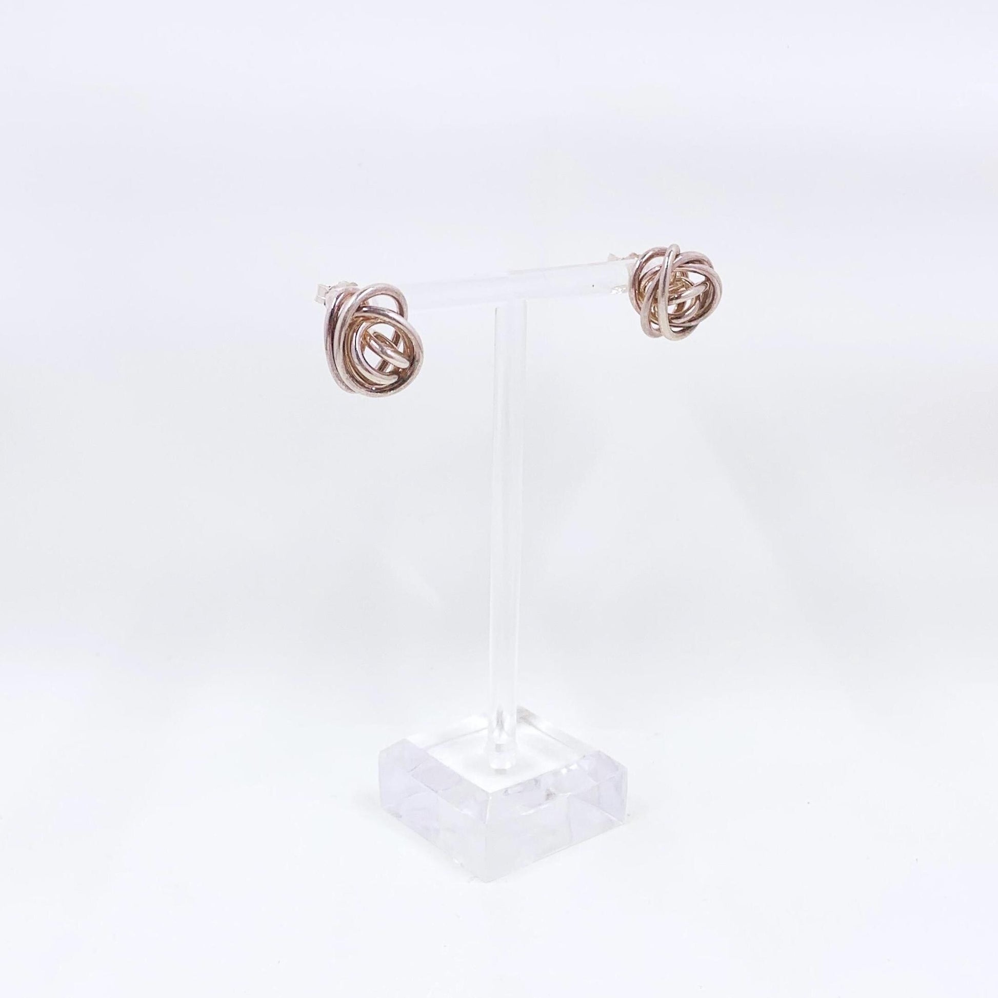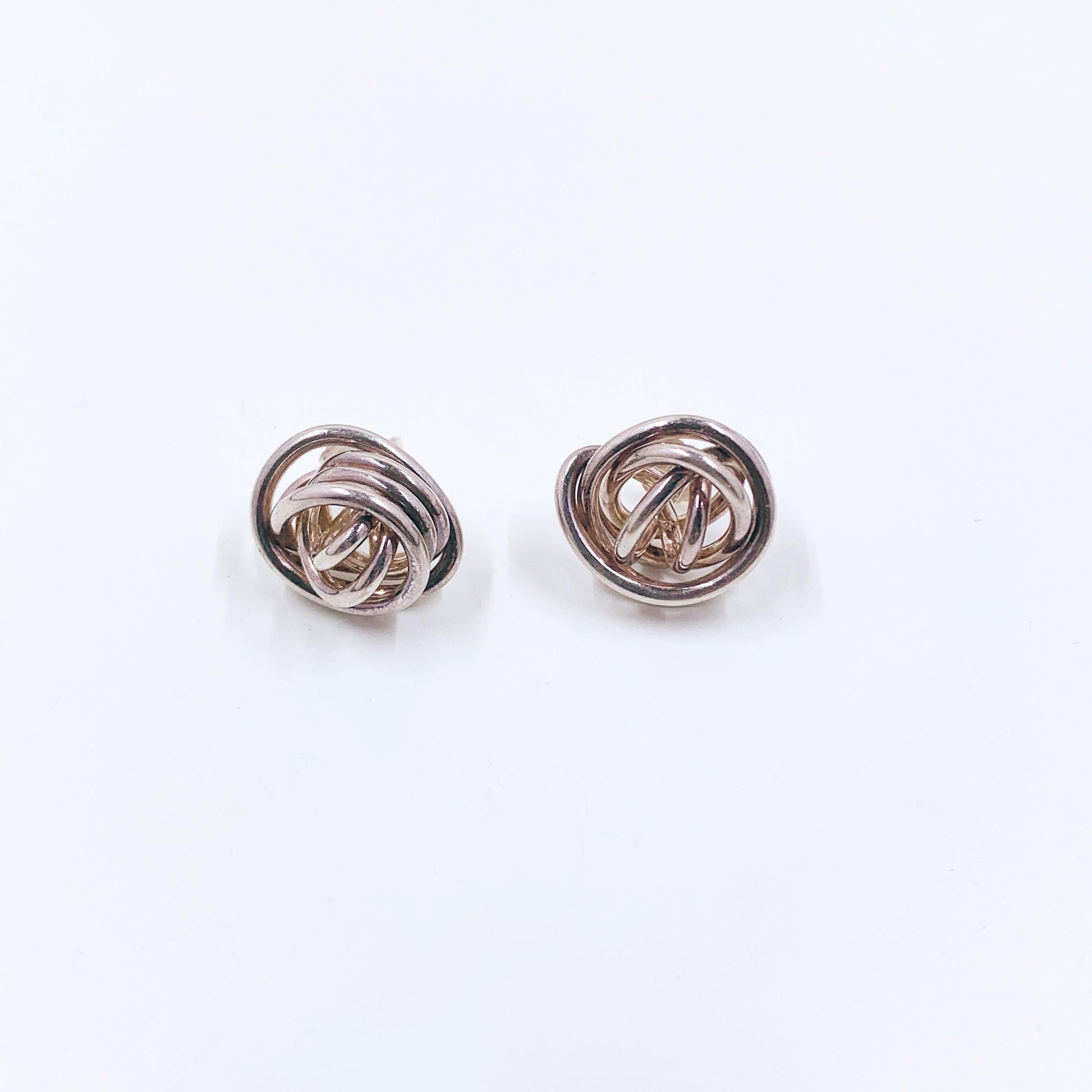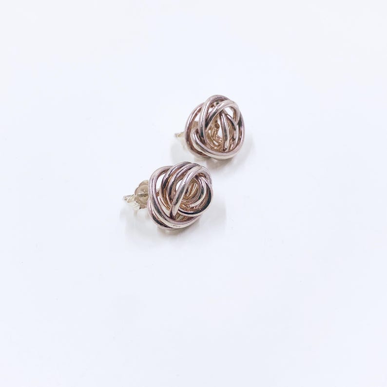 Discover the allure of handcrafted artistry with these distinctive silver swirl knot stud earrings. Each earring appears to be crafted from one piece of silver wire to form a delicate, swirling knotted design. The knotted design gives them a tactile texture that adds depth and visual interest. Perfect for those who appreciate the unique and unconventional, these earrings offer a captivating blend of texture and sculptural form.