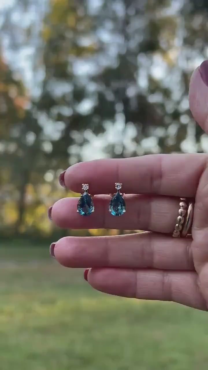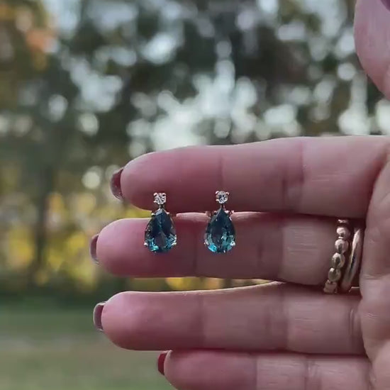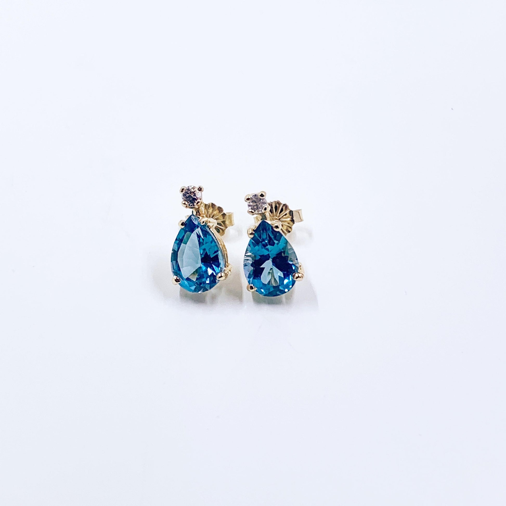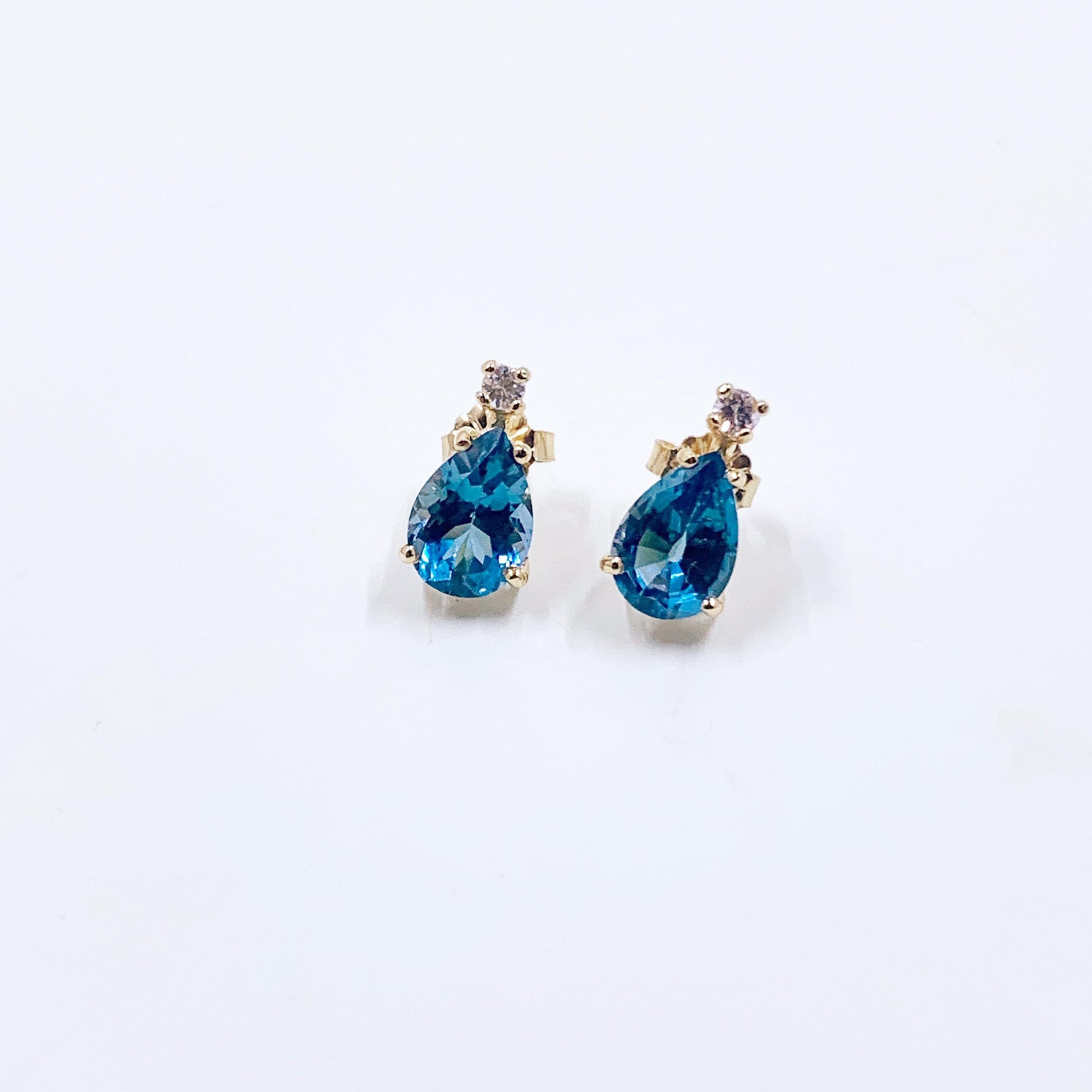 These exquisite 14K gold stud earrings feature a captivating combination of vibrant blue topaz and shimmering white sapphires. Each earring showcases a brilliant, pear-shaped (teardrop) blue topaz, known for its vibrant, clear blue hue and elegant teardrop silhouette that beautifully frames the face. Positioned above the blue topaz, a sparkling round white sapphire adds extra brilliance and a delicate touch, enhancing the central stone's beauty. These earrings effortlessly transition from casual daytime wear to elegant evening events, making them incredibly adaptable to your wardrobe.